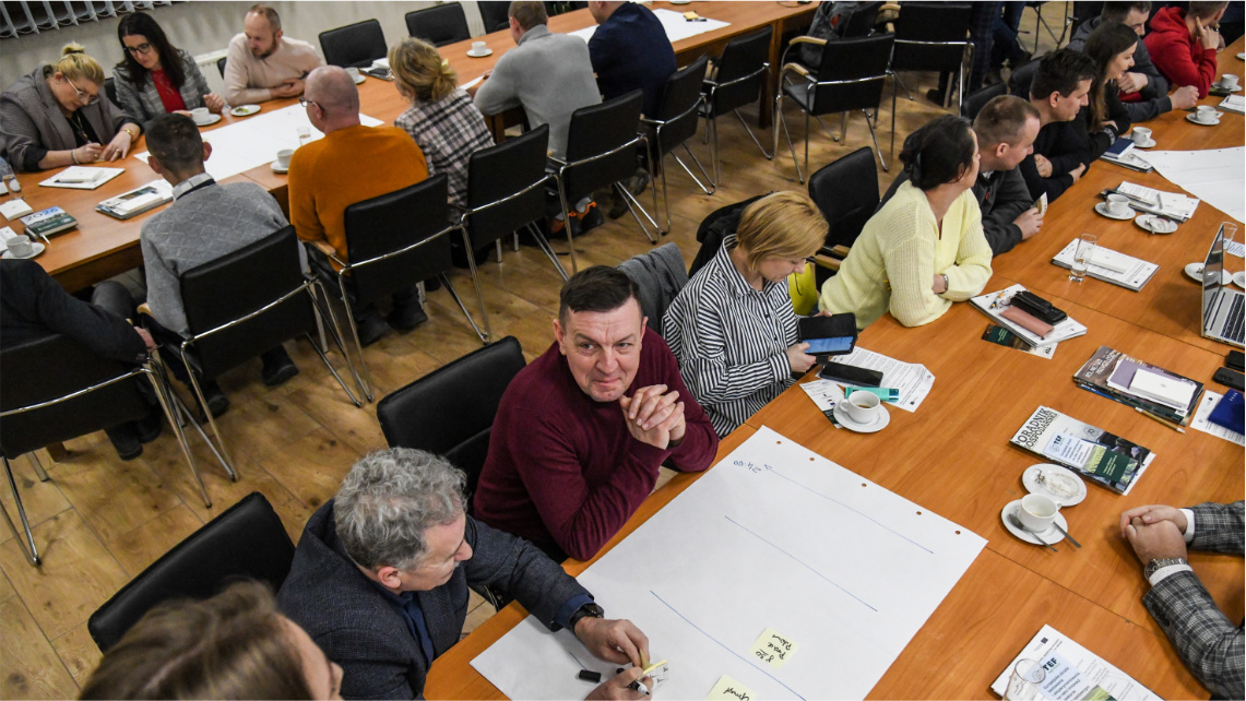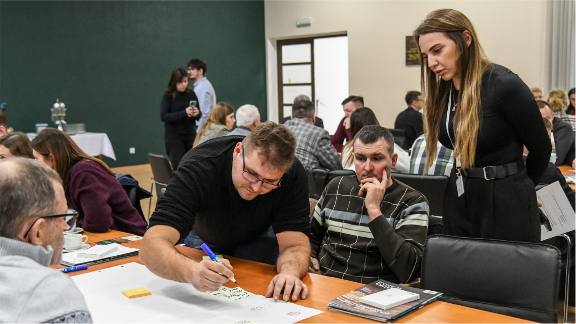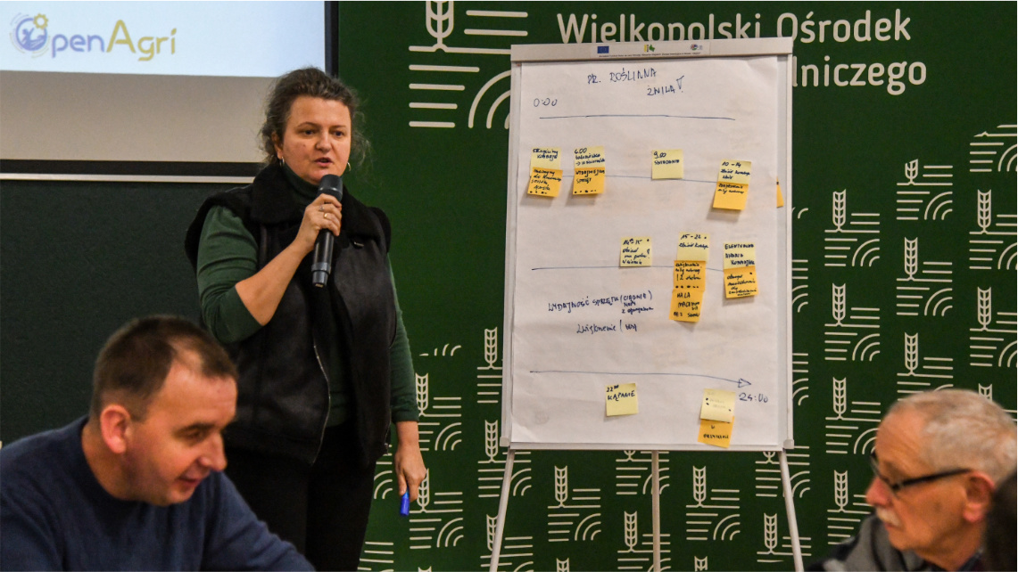 W dalszej części spotkania uczestnicy wzięli udział w warsztatach „Otwarte technologie i rozwiązania cyfrowe wspierające rozwój wielkopolskiego rolnictwa” poprowadzonych przez Piotra Nowaka z Sieci Badawczej Łukasiewicz – Poznańskiego Instytutu Technologicznego. Warsztaty zrealizowane w formule co-creation, z wykorzystaniem metodyki design thinking, stanowiły element projektu OpenAgri.