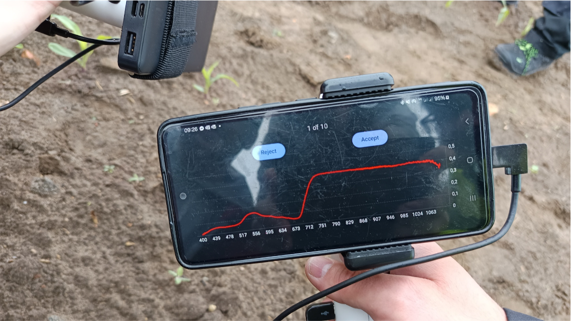 Na 2 hektarach uprawy kukurydzy, a dokładniej na osobnych 81 poletkach, na różnym etapie rozwoju rośliny, podczas 7 kampanii i 13 sesji badawczych sprawdzane były specjalnym spektometrem obecne w niej składniki pokarmowe. Oceniany był między innymi poziom potasu, fosforu, magnezu. Rośliny były ręcznie zbierane zgodnie z przyjętą metodologią, rozczłonkowywane i przewożone do laboratorium.