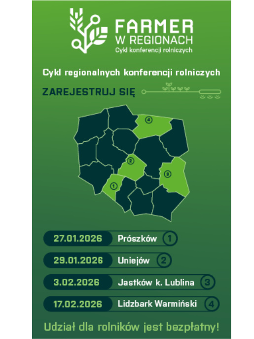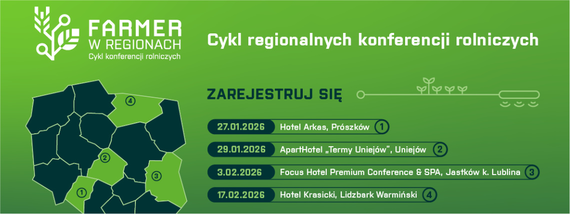 Redakcja miesięcznika oraz portalu farmer.pl organizuje cztery regionalne konferencje „Farmer w Regionach”. Niestety żadna nie odbywa się w Wielkopolsce, ale każda z nich będzie okazją do spotkania z ekspertami, wysłuchania praktycznych wykładów i rozmowy o tym, jak zwiększać opłacalność gospodarowania w warunkach ciągłych zmian rynkowych i klimatycznych.